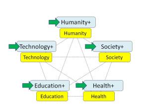 But there is good reason for this hope. We have in our favour the fact that improvements in any one of these areas feeds into improvements elsewhere. As our technology improves, our education improves, and so on. Rather than simply focusing on spending more money on each of these areas, we can focus on spending money more smartly on each area. Raising our game – in ways that I’ll explain – means that instead of “Education”, we can talk of “Education+”. Instead of “Health”, we can speak of “Health+”. Instead of “Technology”, we can speak of “Technology+”. Instead of “Society”, we can speak of “Society+”. And – you guessed it – instead of “Humanity”, we can speak of “Humanity+”.
