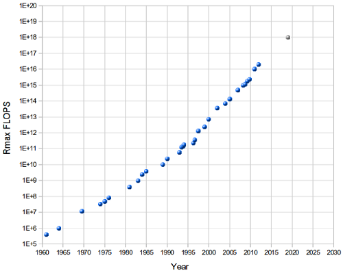 This repeated doubling of performance, on a fairly regular schedule, is a hallmark of what is often called “Moore’s Law”, following a paper published in 1965 by Gordon Moore (subsequently one of the founders of Intel). It’s easy to find other examples of this exponential trend within the computing industry. University of London researcher Shane Legg has published a chart of the increasing power of the world’s fastest supercomputers, from 1960 to the present day, along with a plausible extension to 2020. This chart measures the “FLOPS” capability of each supercomputer – the number of floating point (maths) operations it can execute in a second. The values move all the way from kiloFLOPS through megaFLOPS, gigaFLOPS, teraFLOPS, and petaFLOPS, and point towards exaFLOPS by 2020. Over sixty years, the performance improves through twelve and a half orders of magnitude, which is more than 40 doublings. This time, the doubling period works out at around 17 months.