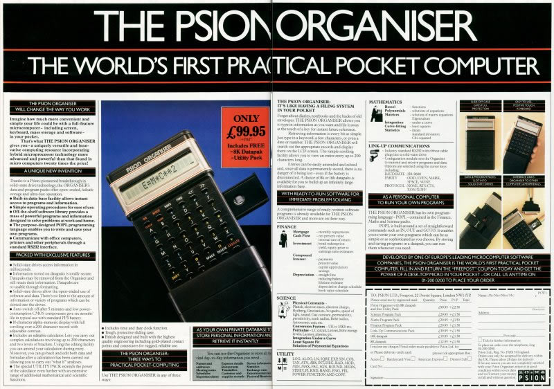 Last, but not least, I am bound to mention the very considerable thinking that took place at Psion, from the early 1980s onwards. When I started work at Psion as a software engineer in June 1988, I discovered that a huge amount of design had already taken place for what would eventually become the Psion Series 3 communicator. That design was an iteration on what Psion had learned in a number of earlier projects, including two generations of handheld organiser products. On the launch of the Organiser in 1984, Psion had declared the device to be “The world’s first practical pocket computer”. This phrase headlined a magazine promotion which can be found, along with lots of other useful archive material, on Eddie Slupski’s ‘Bioeddie’ website. The magazine article went on: “The Psion Organiser will change the way you work.” It was a prescient claim.