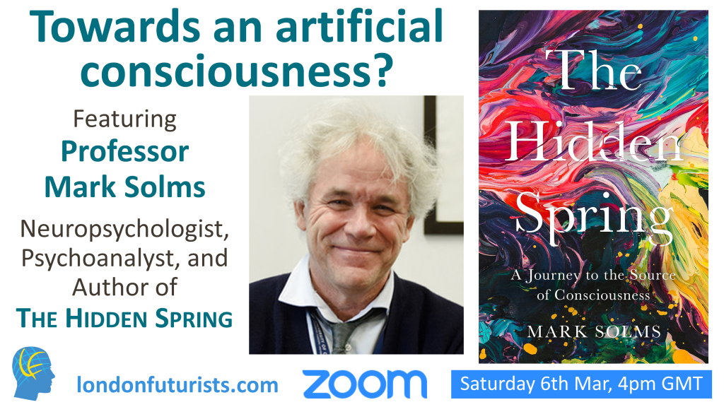 What next? That’s a question that I’ll be exploring this Saturday, 6th March, when Mark Solms will be speaking to London Futurists. The title of his presentation will be “Towards an artificial consciousness”.
