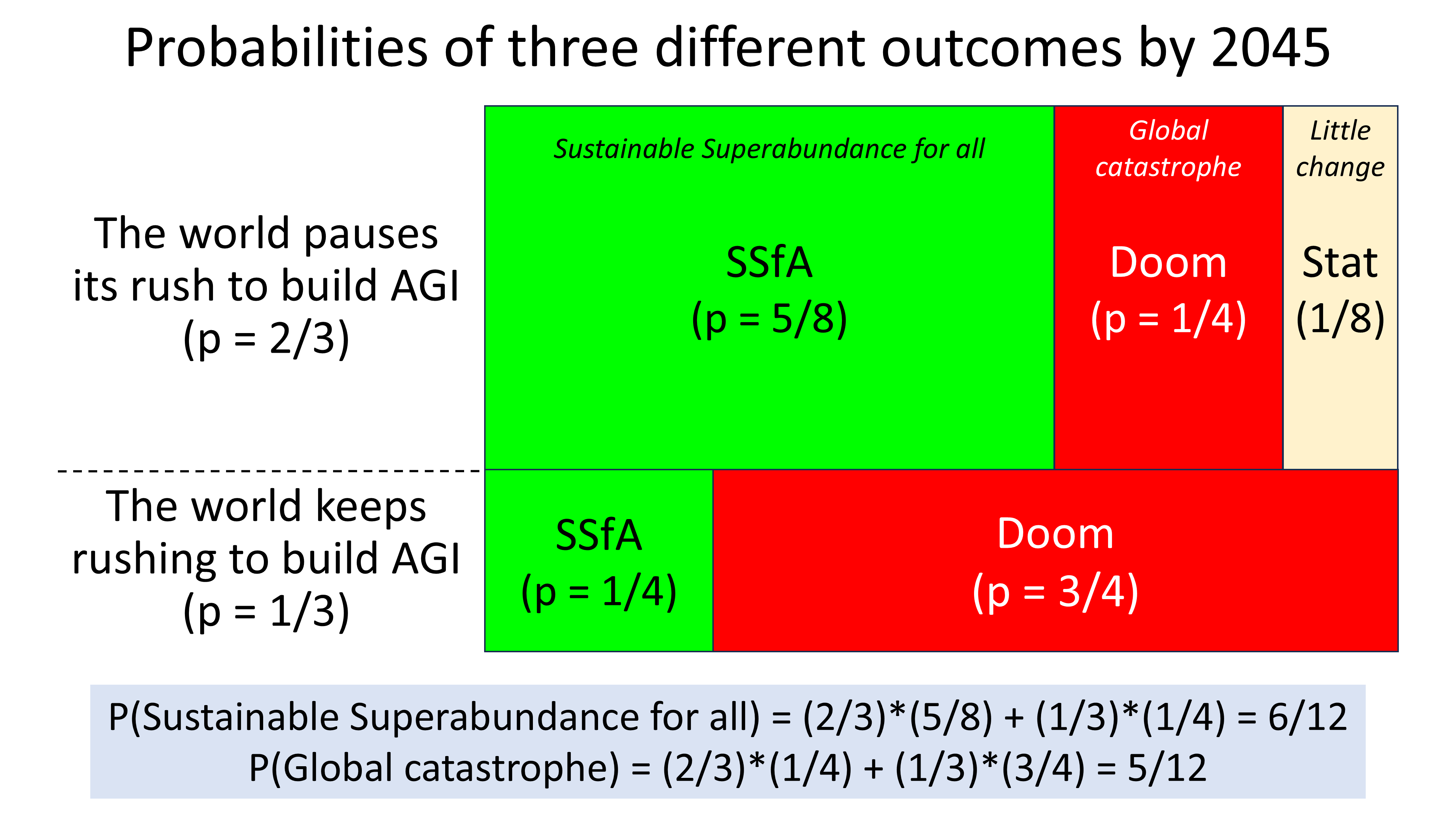 The next time someone asks me what’s my p(Doom), compared with my p(SSfA) (the probability of Sustainable Superabundance for all), I may try to talk them through a diagram like this one. In particular, we need to break down the analysis into two cases – will the world keep rushing to build AGI, or will it pause from that rush.