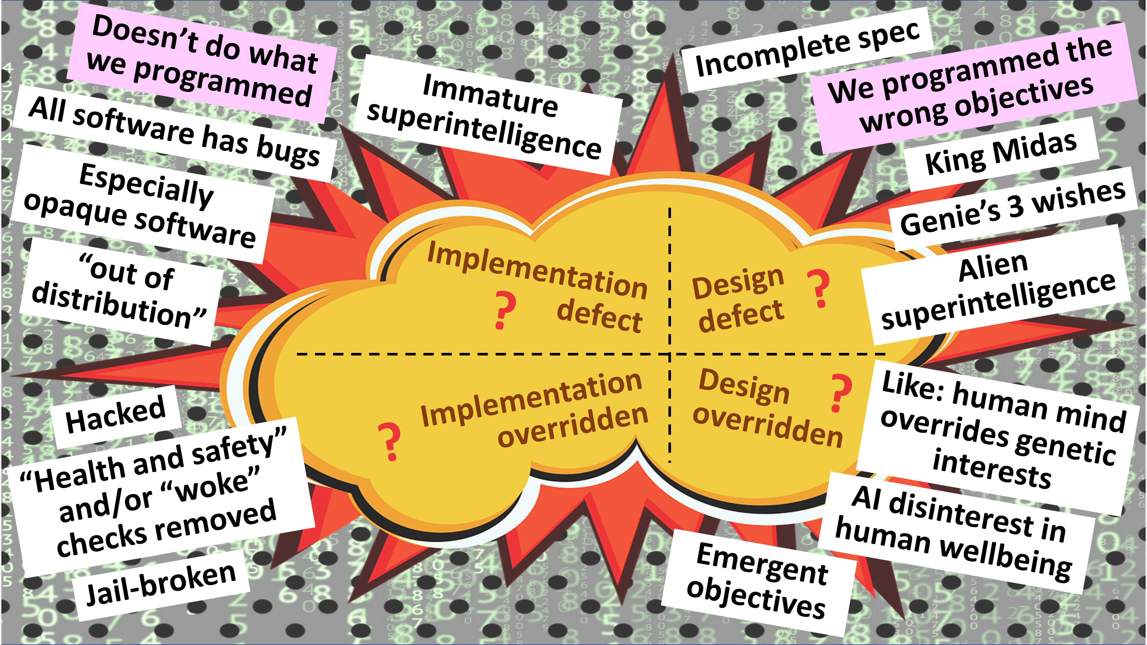 But on the contrary, it’s not just a single failure scenario that we need to consider. There are multiple ways in which advanced AI can lead to catastrophe – if it is misconfigured, hacked, has design flaws, encounters an environment that its creators didn’t anticipate, interacts in unforeseen ways with other advanced AIs, etc, etc.